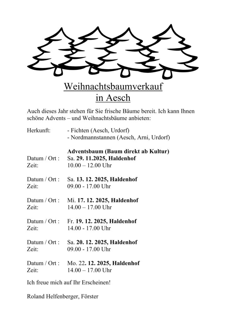 Auch dieses Jahr werden auf dem Haldenhof wieder schöne Weihnachtsbäume aus der Region in verschiedenen Grössen zum Verkauf angeboten. Alle wichtigen Informationen sowie die Daten und Öffnungszeiten finden Sie hier. Wir freuen uns auf Ihren Besuch.